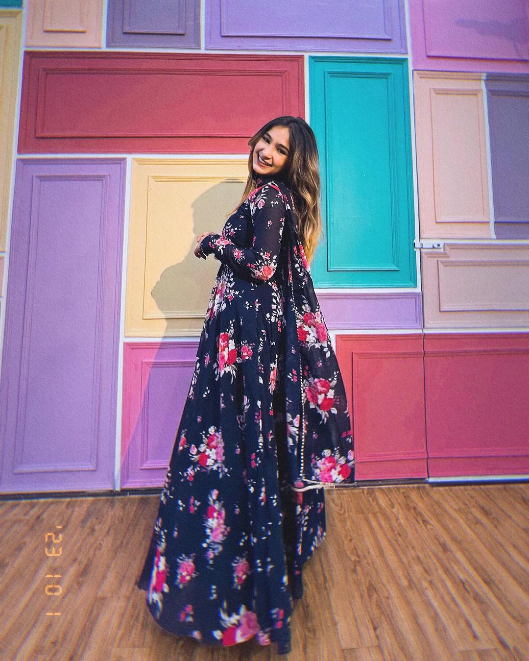 Kiran Rana In Floral Navy Blue Color Anarkali Suit