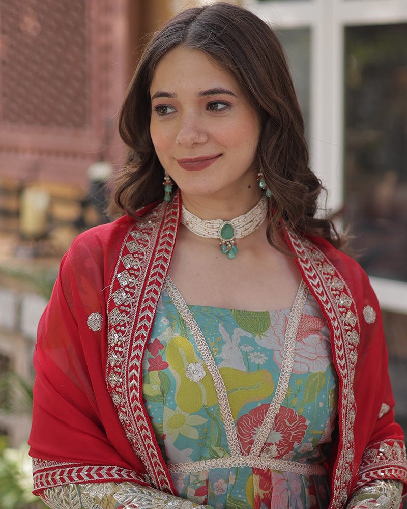 Make a fresh style statement with this Lime Green Color Alia Cut Embroidered Gown. Featuring intricate embroidery and a flattering Alia cut silhouette, it comes with a matching dupatta for a graceful, festive look.