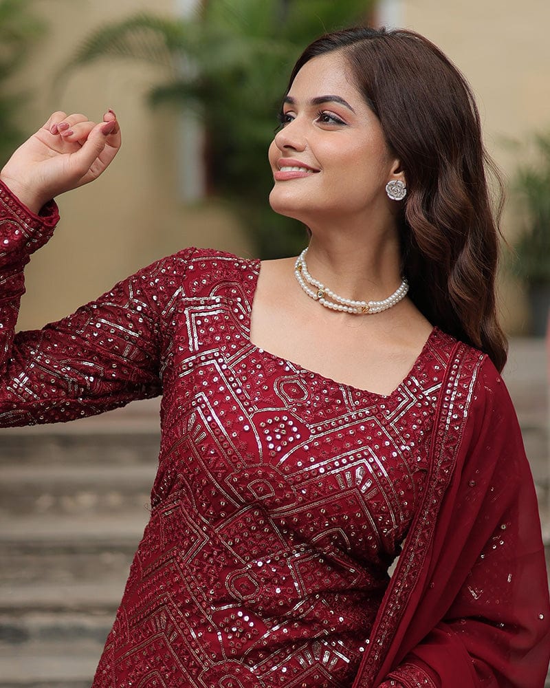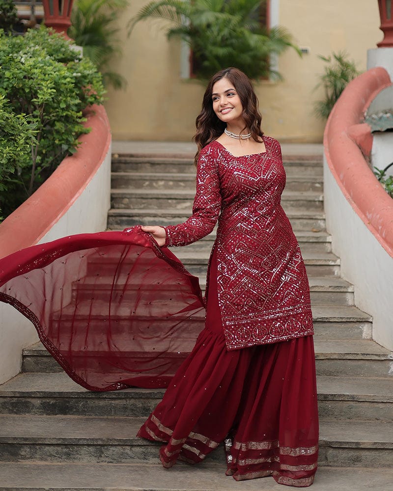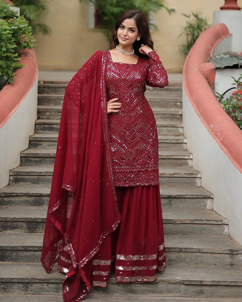 Maroon Color Faux Georgette Embroidered Sharara Suit