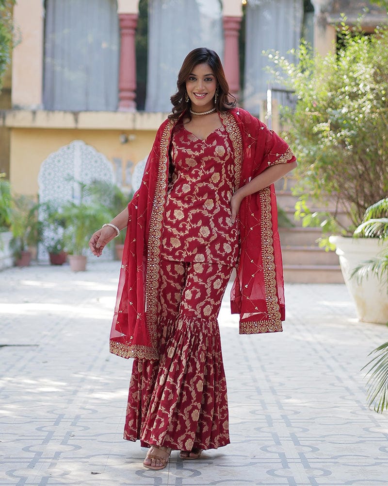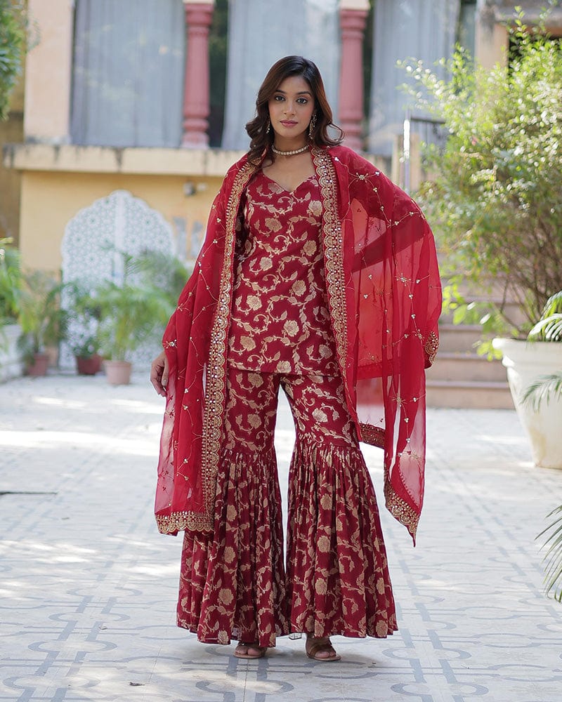 This elegant Maroon Georgette Jacquard Gharara Suit showcases intricate jacquard patterns and a flowing design. Perfect for festive occasions and weddings, it exudes traditional charm with a modern twist.