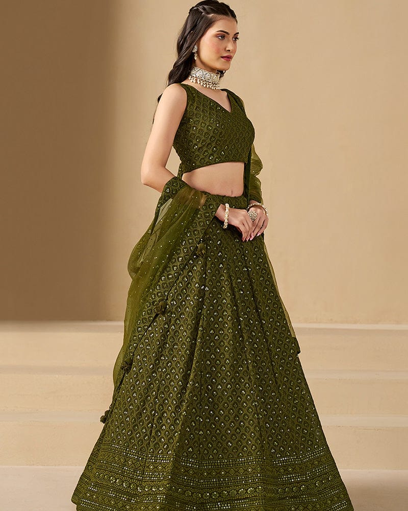 Mehndi Color Georgette Embroidered Lehenga Choli With Dupatta