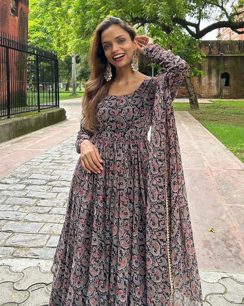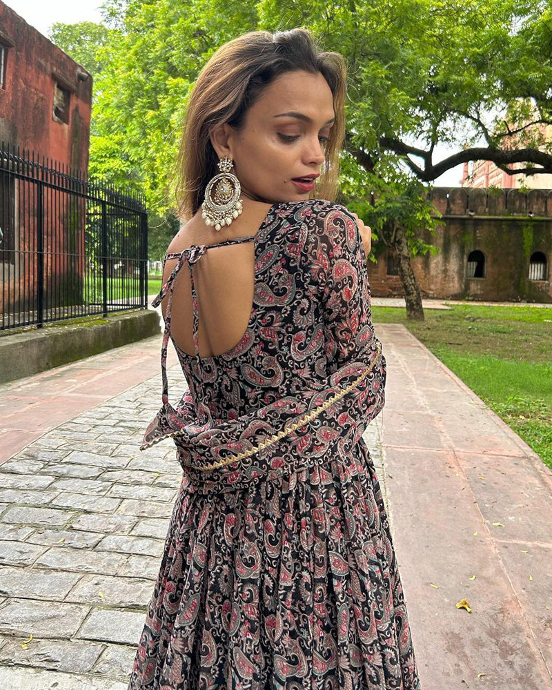 The Mango Kalamkari Printed Full Stitched Three Piece Anarkali Suit is a beautifully designed ethnic outfit that exudes grace and elegance. This three-piece ensemble includes a full-length Anarkali dress, bottoms (salwar or churidar), and a matching dupatta.