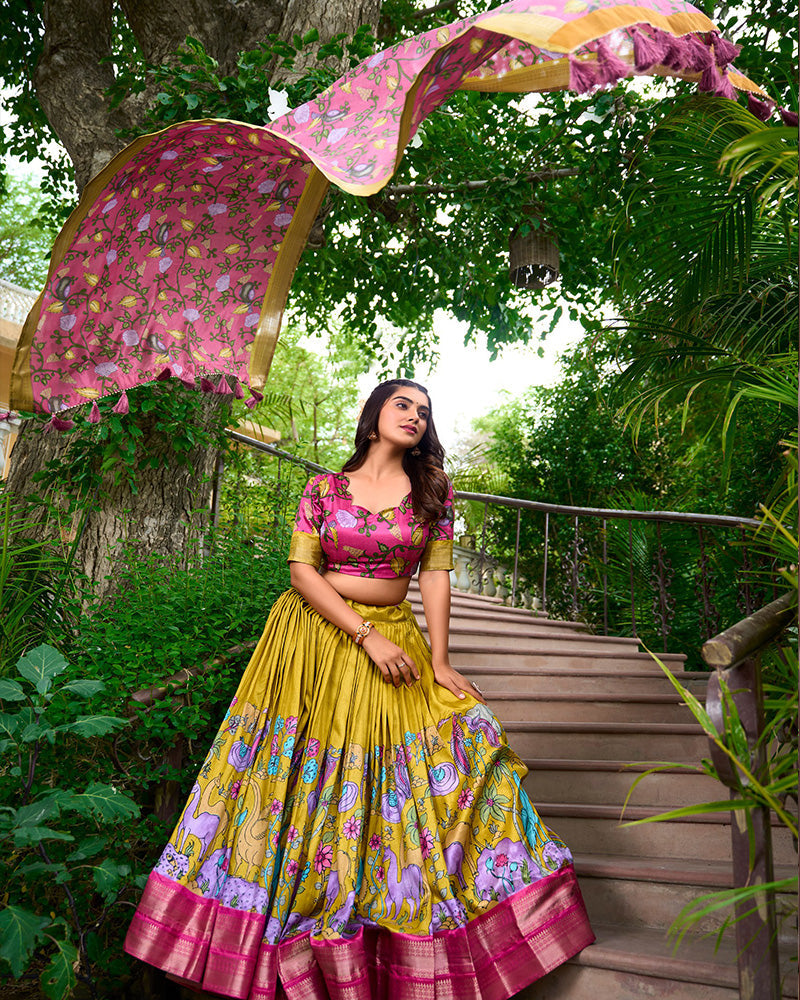 Mustard Color Dola Silk Designer Kalamkari Print Lehenga Choli