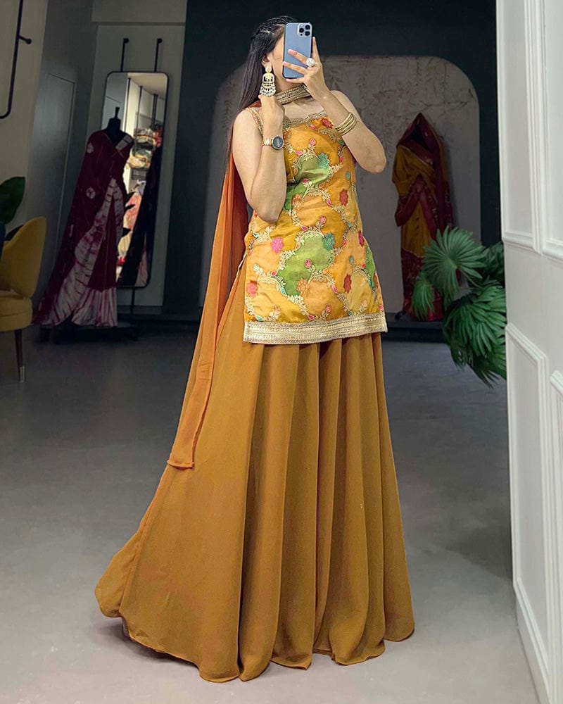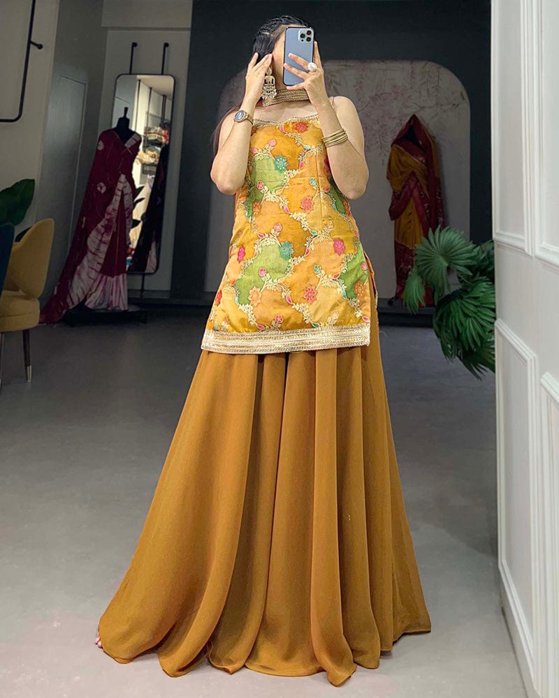 Mustard Color Jacquard Weaving Work Plazo Suit
