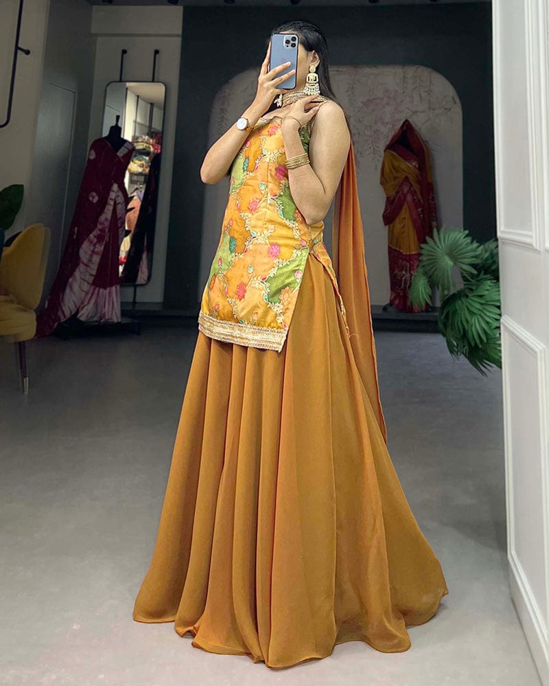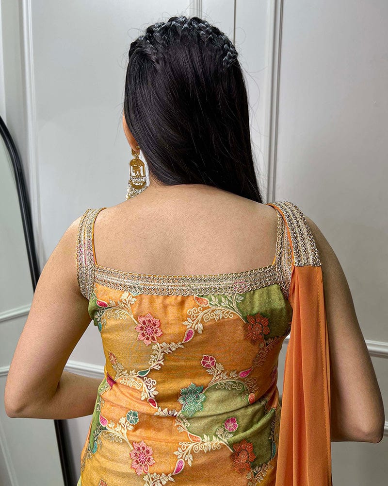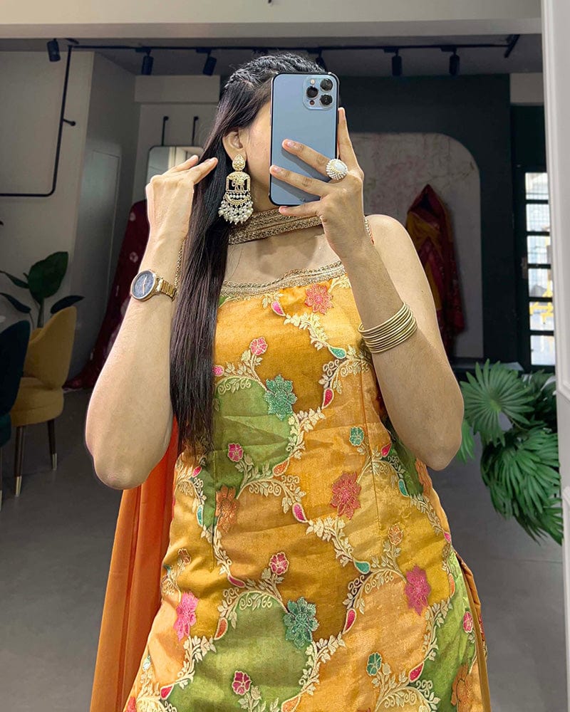 "Radiate sophistication in our Mustard Color Jacquard Weaving Work Plazo Suit. This elegant set includes an intricately designed plazo with an unstitch blouse, perfect for any festive or formal occasion."