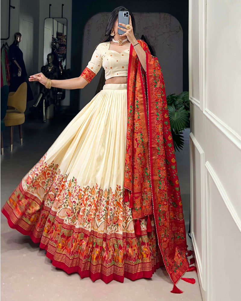 Off White Color Tussar Silk Printed With Foil Work Lehenga Choli