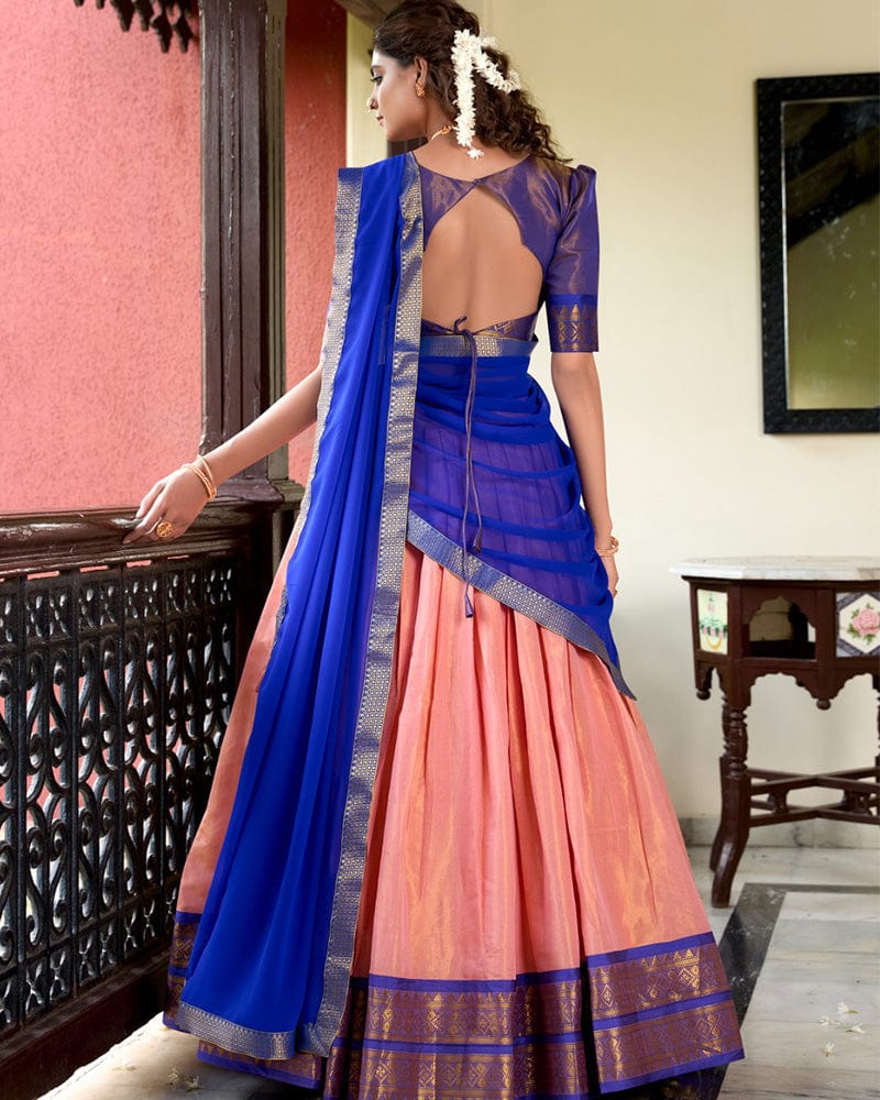 This elegant peach Kanchipuram designer lehenga choli showcases traditional artistry with its luxurious fabric and intricate detailing. Ideal for weddings, receptions, and festive occasions, it exudes timeless charm and sophistication. Paired with an unstitched blouse piece, it offers the flexibility to create a customized and graceful look.