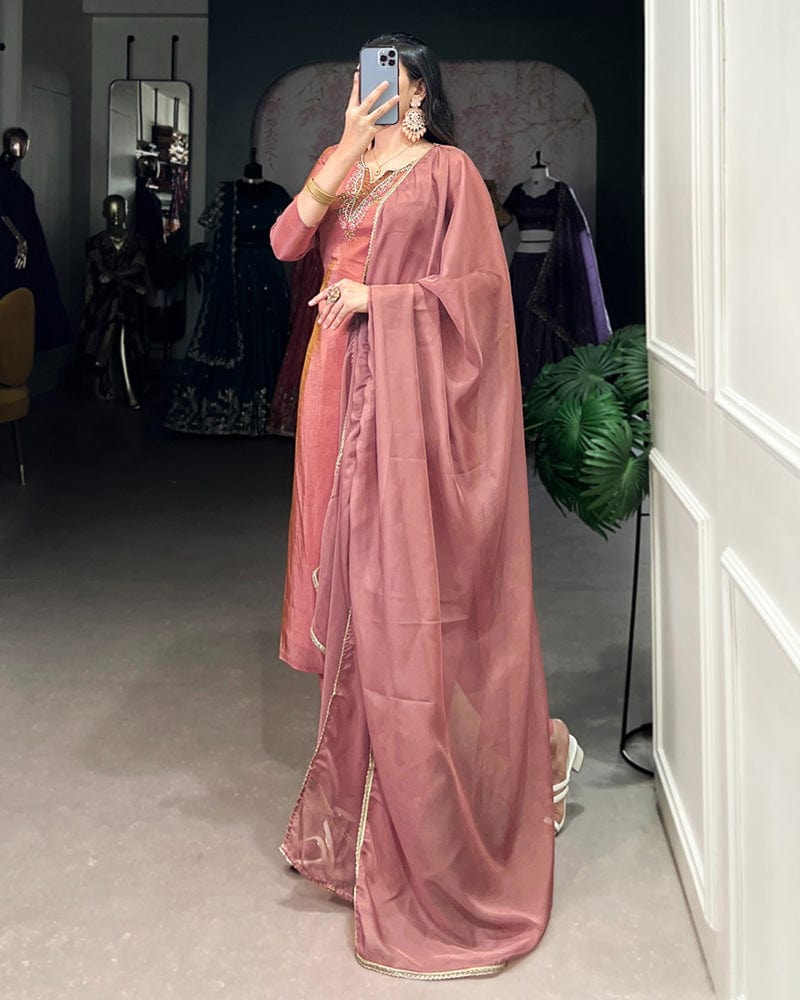 Stylish Peach Color Viscose Tissue Three Piece Kurti Suit crafted from lightweight viscose tissue fabric, offering a soft shimmer and elegant look. This set includes a kurti, bottom, and matching dupatta, perfect for festive occasions and celebrations.