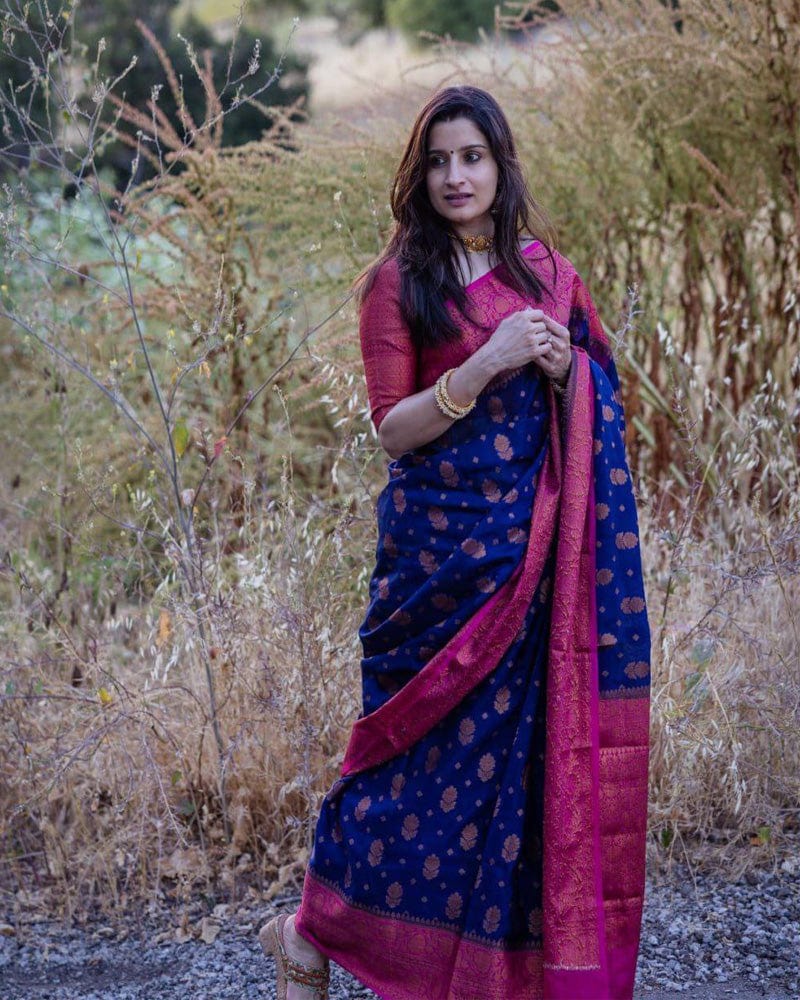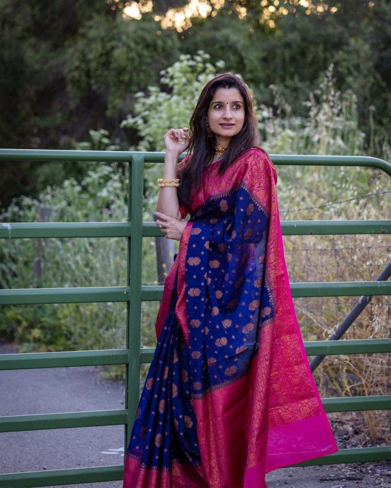 Adorn yourself in the timeless charm of this Pink and Blue Banarasi Silk Saree, a captivating ensemble that beautifully blends tradition with modern aesthetics. The luxurious Banarasi silk fabric drapes gracefully, creating an elegant and regal silhouette. The harmonious combination of pink and blue hues adds a delightful contrast, making it a perfect choice for various occasions. The saree is adorned with intricate detailing, showcasing the artistry of Banarasi craftsmanship. Paired with an unstitched blouse piece, this ensemble allows for a personalized touch to your style. Make a lasting impression at weddings or festive celebrations with this Pink and Blue Banarasi Silk Saree, a symbol of refined elegance and cultural richness.