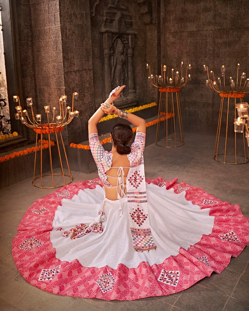 Pink And White Color Jacquard Cotton Thread With Mirror Work Navratri Lehenga Choli