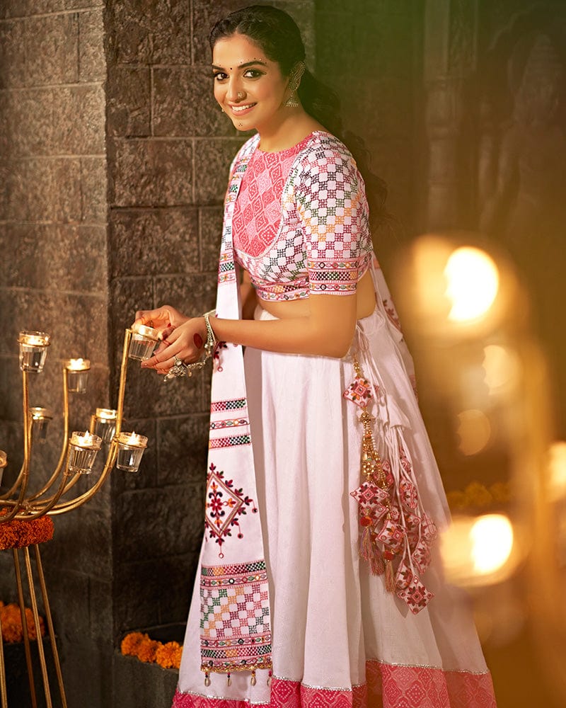 Introducing the Pink And White Color Jacquard Cotton Thread With Mirror Work Navratri Lehenga Choli, a graceful ensemble designed for festive celebrations. Crafted from high-quality jacquard cotton fabric, this Lehenga Choli features intricate mirror work detailing that adds a touch of elegance and allure. The harmonious combination of pink and white colors creates a delightful contrast, perfect for Navratri festivities. Accompanied by an unstitched blouse, this outfit offers customization options for a comfortable and personalized fit. Embrace the festive spirit in style with this exquisite Navratri Lehenga Choli, radiating beauty and charm with every step.