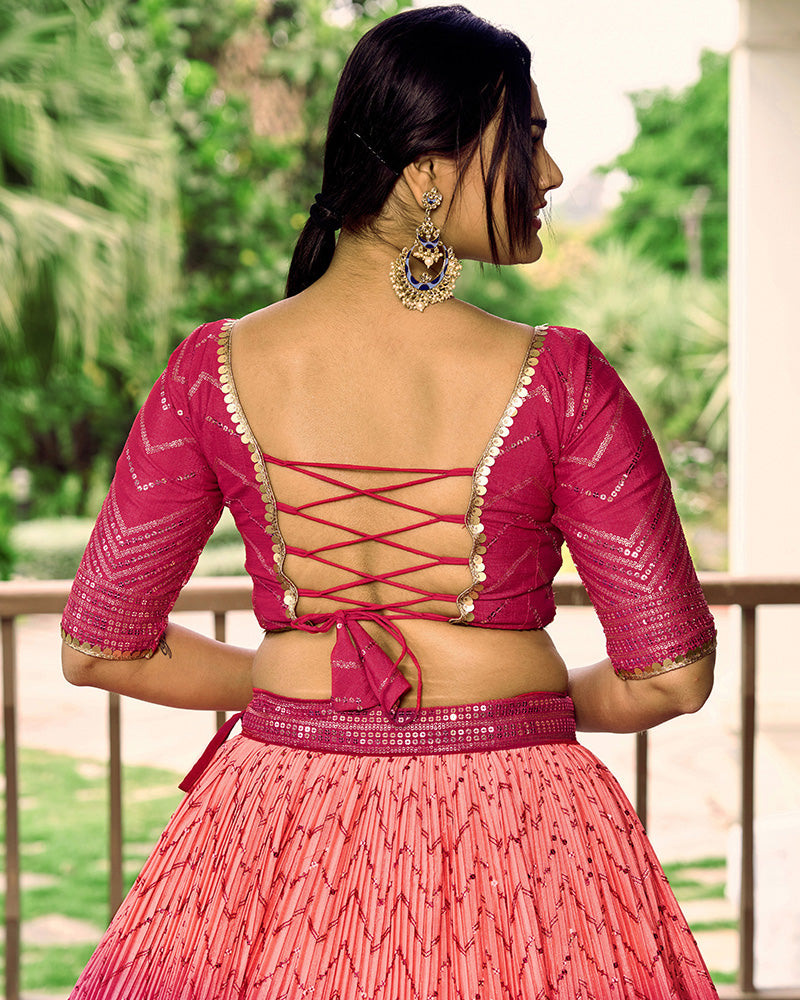 This Pink color Chinon lehenga choli is beautifully embroidered, combining elegance with traditional charm. It comes with an unstitch blouse, offering the flexibility to customize your look, making it a perfect choice for festive occasions like Navratri.