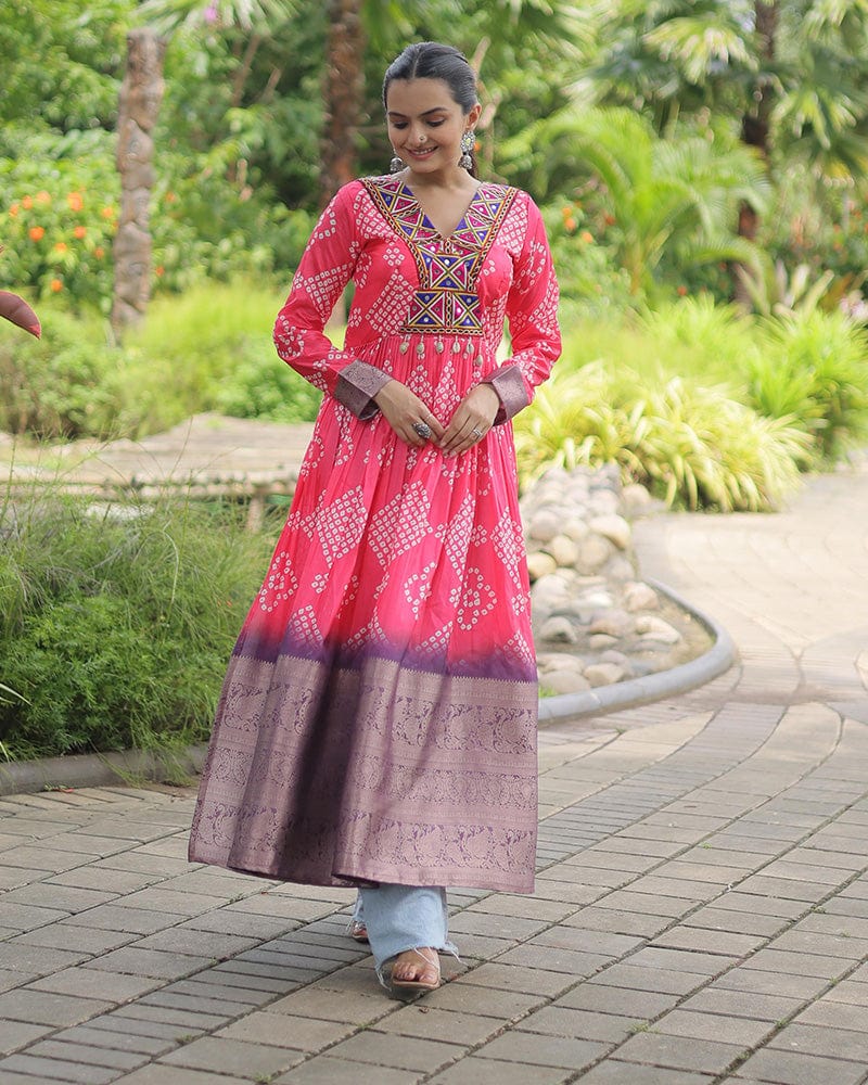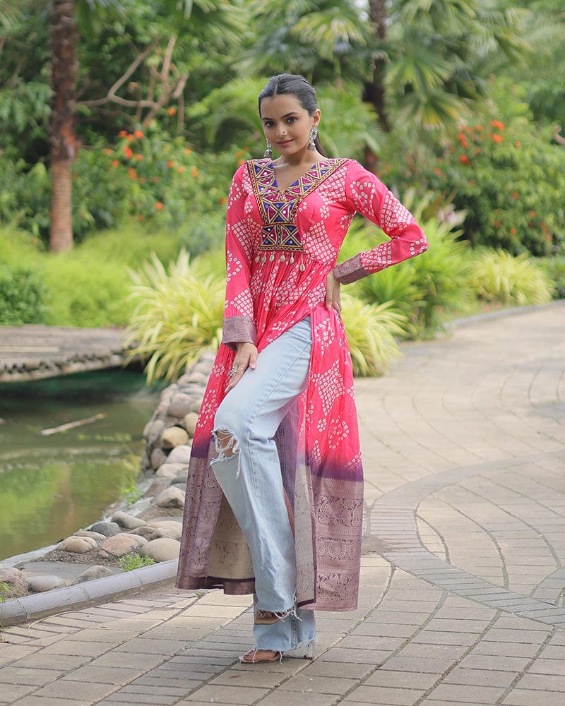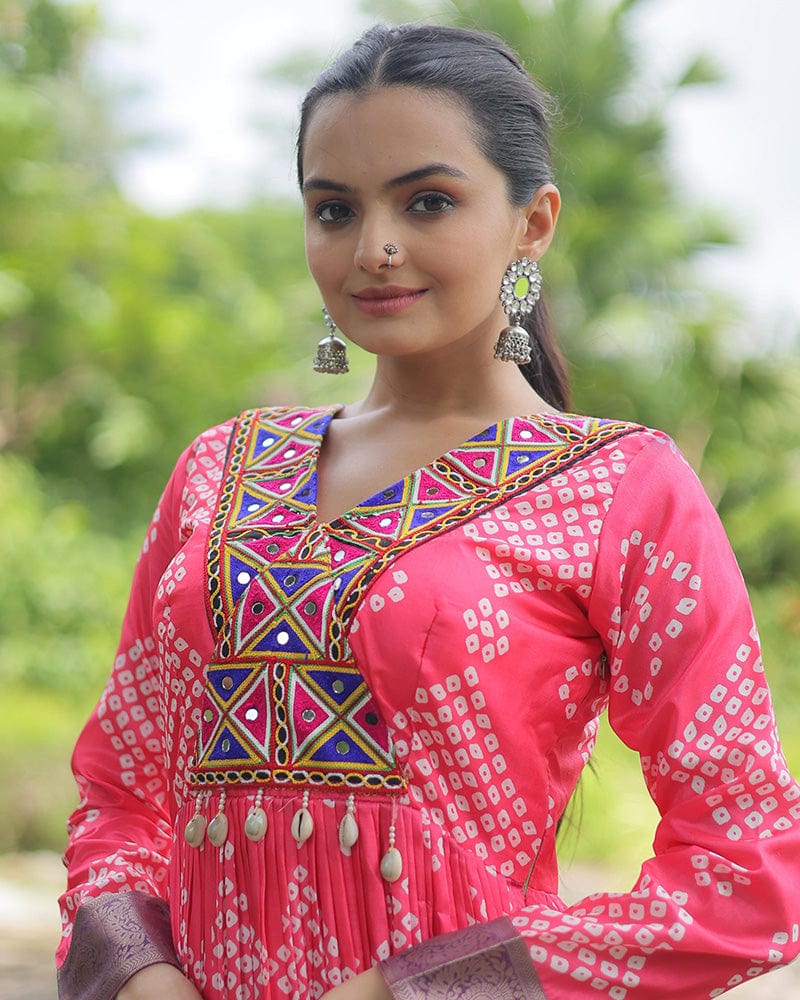 Celebrate the festive spirit with this elegant pink cotton printed Navratri kurti. Its soft, breathable fabric offers comfort, while the traditional print adds a touch of ethnic charm. Perfect for pairing with a lehenga or leggings, this kurti is ideal for Garba nights and festive occasions.