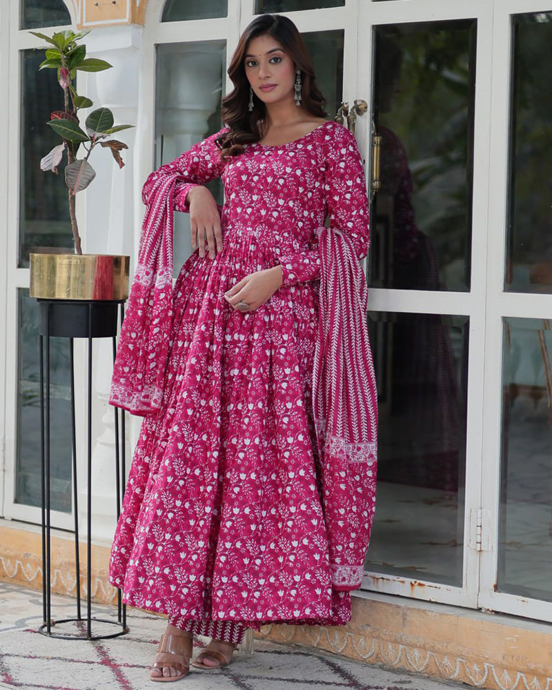 Elegant Pink Color Printed Pure Cotton Three-Piece Kurti Suit featuring soft, breathable fabric and beautiful prints. Perfect for casual and festive wear, offering comfort with a touch of traditional charm.