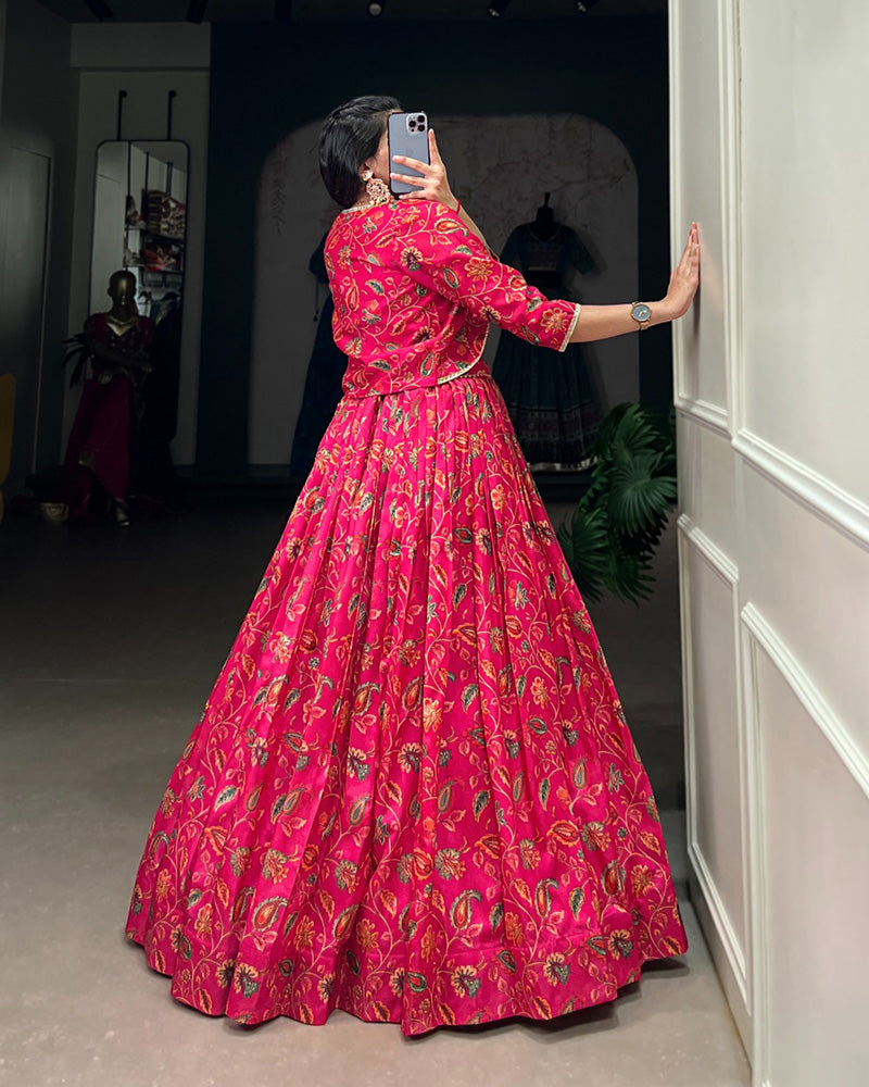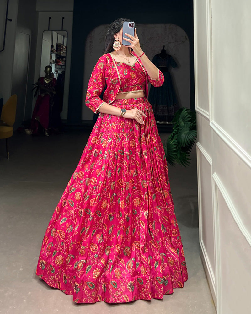 A graceful lehenga choli set in a charming pink hue, crafted from luxurious Tussar silk. The lehenga showcases a smooth texture and elegant design, exuding timeless sophistication. Perfect for weddings, festive events, and special occasions, this ensemble combines traditional beauty with modern elegance.