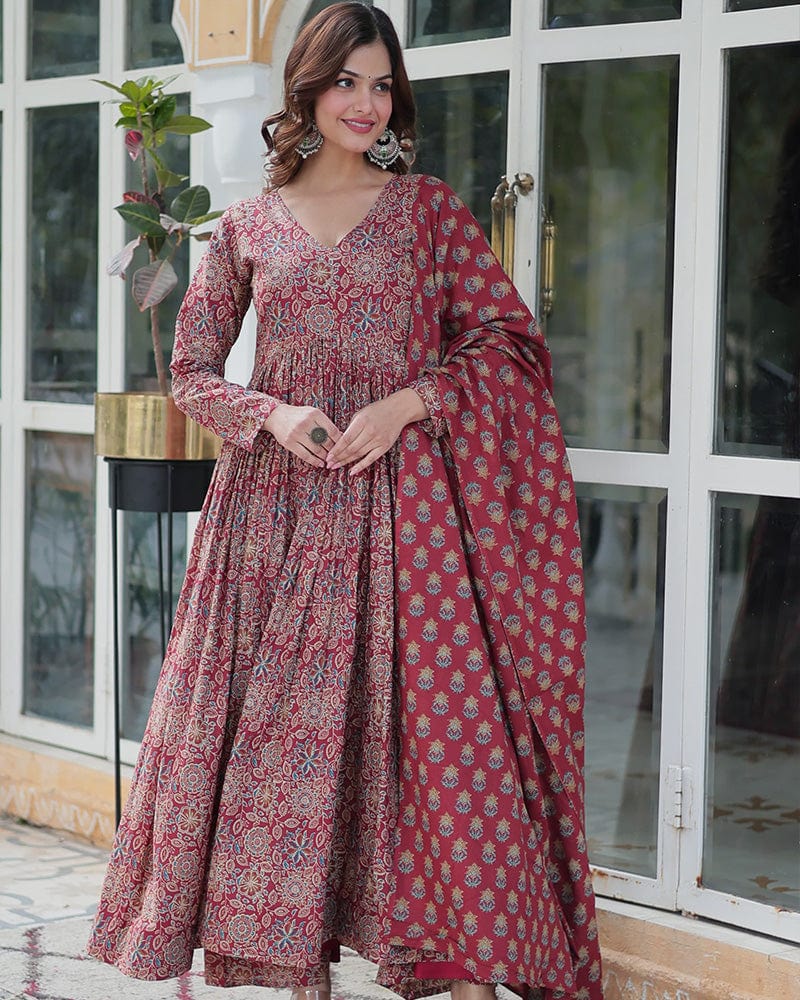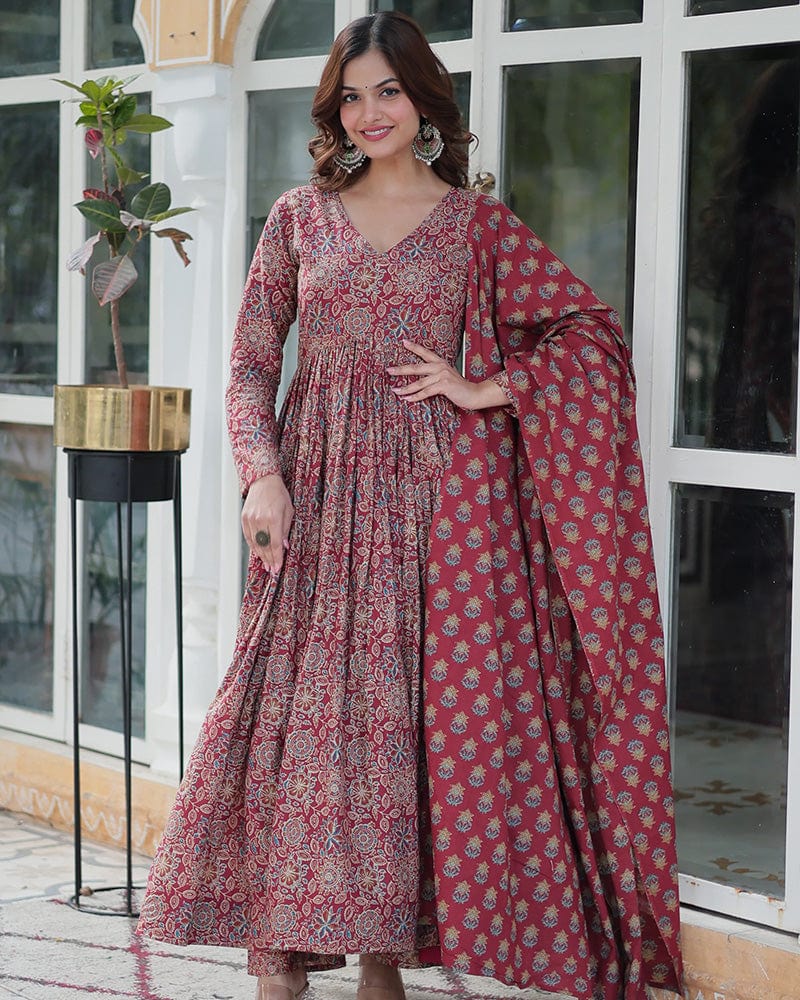 Premium Maroon Color Pure Cotton Kurti With Pant And Dupatta Set