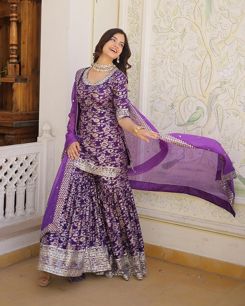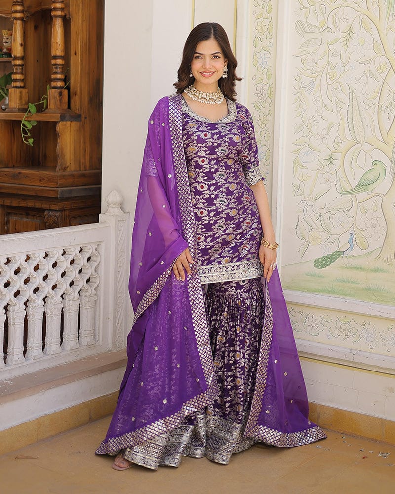 Purple Color Viscose Jacquard Three Piece Gharara Suit