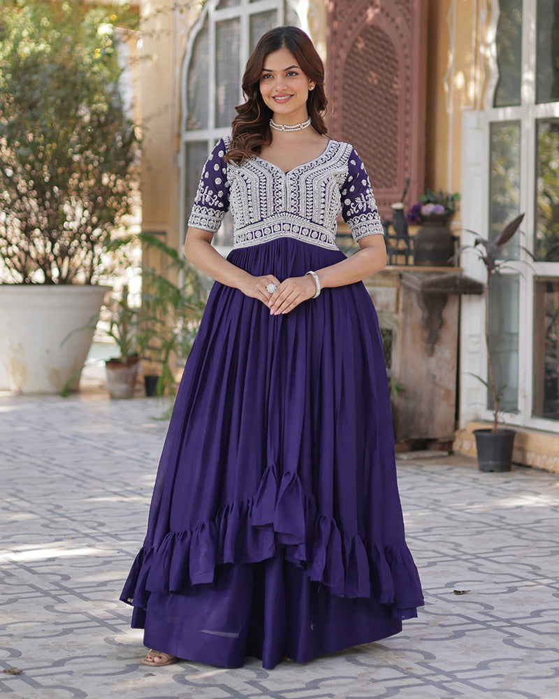 Turn heads in this Purple Color Western Style Embroidered Lehenga Choli. Blending modern design with intricate embroidery, it offers a chic and elegant look—perfect for parties, receptions, and special occasions.