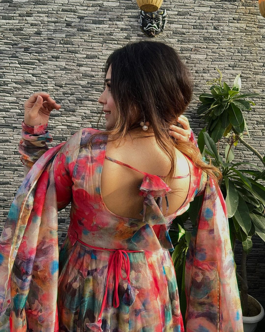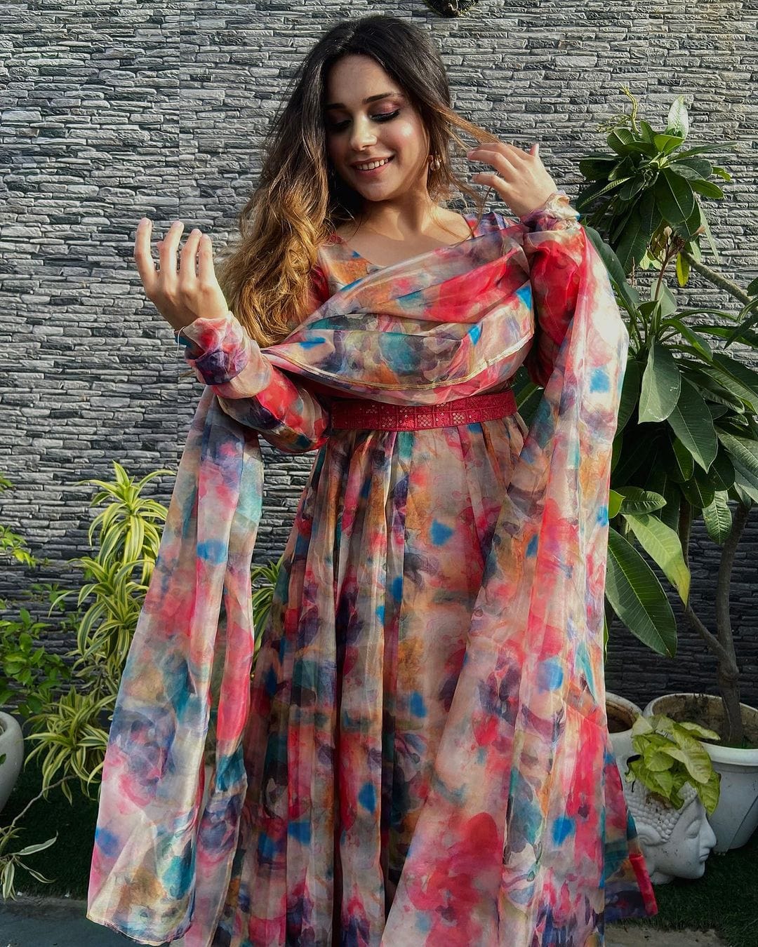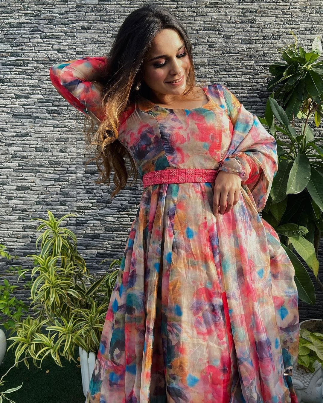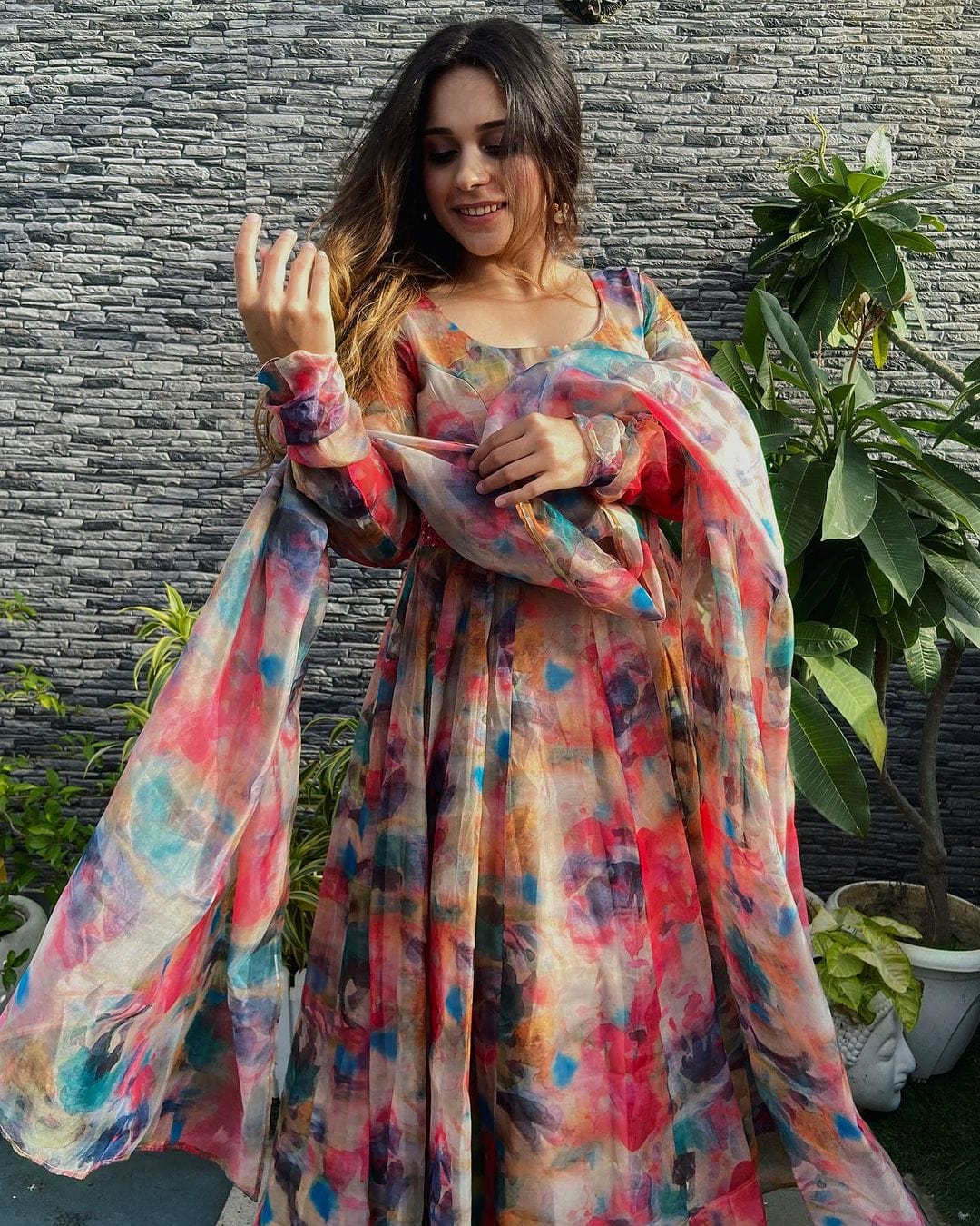 Introducing vibrant charm: the Red Multi Color Print Organza Three Piece Anarkali Suit. Crafted from exquisite organza fabric, this three-piece Anarkali suit exudes elegance and vivacity. The bold red hue serves as a captivating backdrop for the intricate multi-color prints, creating a stunning visual appeal. Perfect for festive occasions or cultural celebrations, the ensemble promises to captivate with its graceful silhouette and vibrant design. Embrace the dynamic allure of multi-color prints with this eye-catching Red Organza Anarkali Suit.