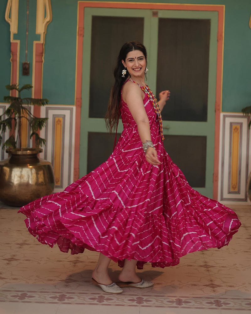 This rani pink chinon Navratri gown showcases a striking Laheriya print, combining vibrant color with traditional design. Perfect for festive occasions, the gown's lightweight fabric provides comfort and ease of movement, making it ideal for celebrating in style.