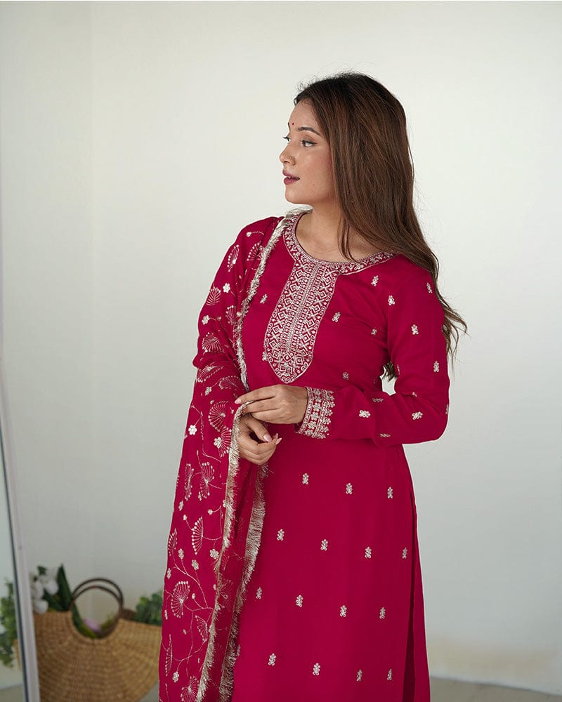 Elegant Rani Pink Rangoli Silk Three-Piece Kurti Suit featuring a beautifully designed kurti, matching pants, and a graceful dupatta. Crafted with soft Rangoli silk, it showcases intricate detailing and a luxurious finish, perfect for festive occasions and celebrations.