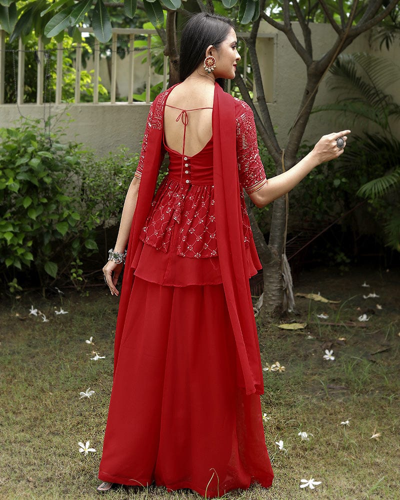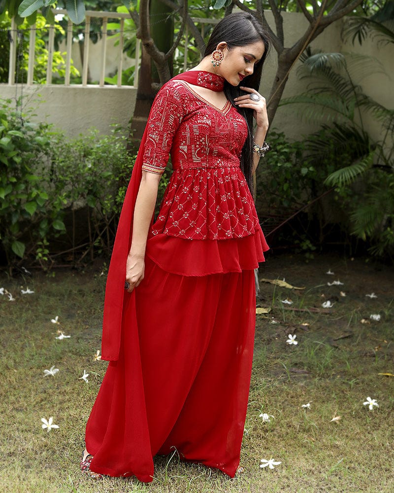 Red Color Georgette Embroidery Work Three Piece Sharara Suit