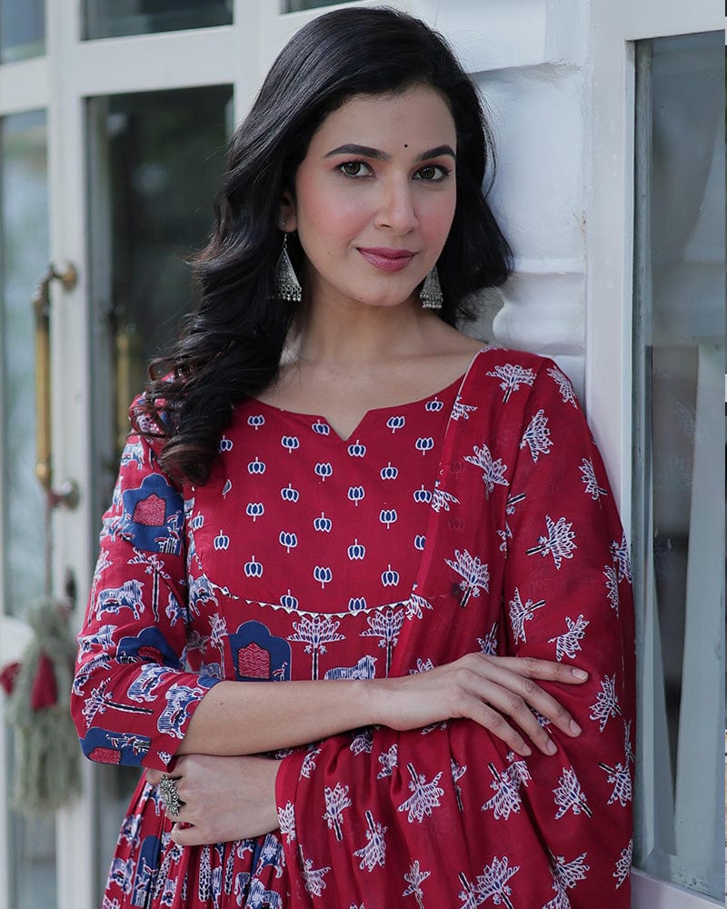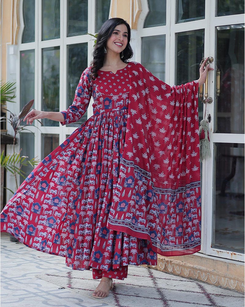 Charming red printed pure cotton three-piece kurti suit, offering comfort and elegance. Perfect for casual outings and festive occasions.