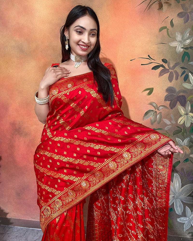 A striking saree in a bold red hue, crafted from premium viscose dolla silk fabric. Its elegant drape and luxurious finish make it perfect for weddings, festive occasions, and grand celebrations. Paired with an unstitched blouse piece, it offers flexibility for personalized tailoring. This ensemble exudes timeless beauty and sophistication.