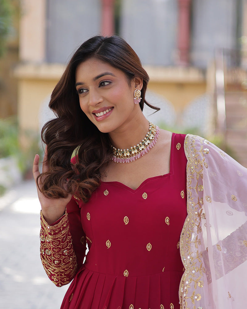 This regal Royal Rani Color Faux Blooming Gown features intricate zari embroidery, creating a luxurious and sophisticated look. Perfect for weddings and special occasions, it offers a stunning blend of elegance and timeless charm.