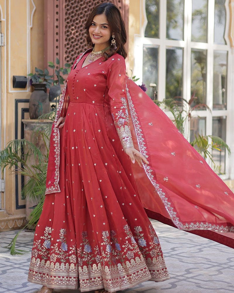 Tomato Color Embroidered Viscose Cosmos Gown With Dupatta