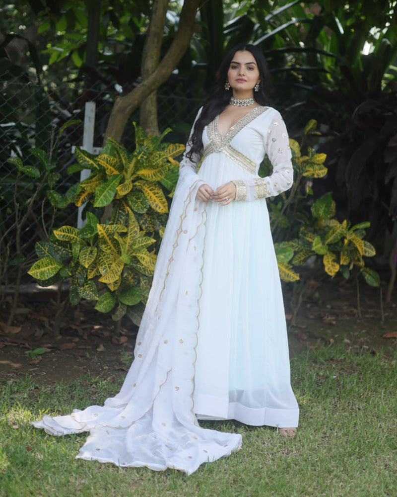 Radiate timeless elegance on your special day with this Wedding Wear Embroidered White Color Alia Cut Gown, accompanied by a Dupatta. The pristine white hue symbolizes purity and grace, while the intricate embroidery enhances the Alia Cut silhouette, creating a stunning ensemble. Meticulously crafted, the gown exudes sophistication and charm, making it an ideal choice for weddings, receptions, or festive occasions. Paired with a complementing dupatta, this Embroidered White Alia Cut Gown promises a captivating and refined presence. Step into the spotlight with this statement piece that celebrates the purity of white and the intricate detailing for an enchanting and memorable look.