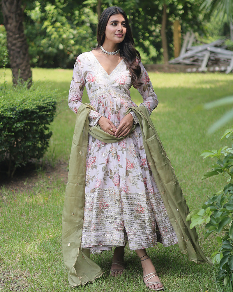 Elevate your wedding attire with this exquisite Off-White Alia Cut Gown adorned with intricate floral embroidery, accompanied by a complementary dupatta. The off-white color exudes sophistication and purity, while the Alia Cut design adds a modern and stylish touch to the ensemble. The gown is embellished with meticulous floral embroidery, showcasing craftsmanship and attention to detail. Paired with a matching dupatta, this ensemble is the perfect choice for a wedding celebration. Make a memorable entrance with confidence and grace, as this Wedding Wear Off-White Alia Cut Gown becomes a symbol of refined fashion and timeless elegance. Embrace the floral allure and make a lasting impression on your special day.