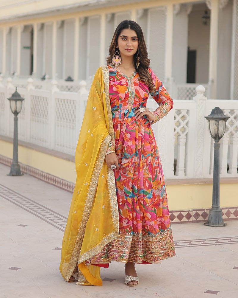 Embrace elegance on your special day with this Wedding Wear Floral Embroidered Pink Color Alia Cut Gown, accompanied by a Dupatta. The soft pink hue exudes romance, while intricate floral embroidery enhances the Alia Cut silhouette, creating a stunning ensemble. Meticulously crafted, the gown exudes sophistication and charm, making it an ideal choice for weddings, receptions, or festive occasions. Paired with a complementing dupatta, this Floral Embroidered Pink Alia Cut Gown promises a captivating and refined presence. Step into the spotlight with this statement piece that celebrates the romantic charm of pink and the intricate floral detailing for an enchanting and memorable look.