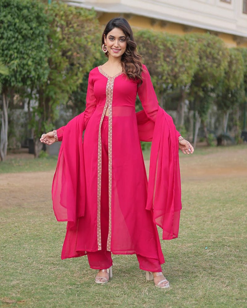 Western Designer Rani Pink Color Georgette Three Piece Kurti Suit