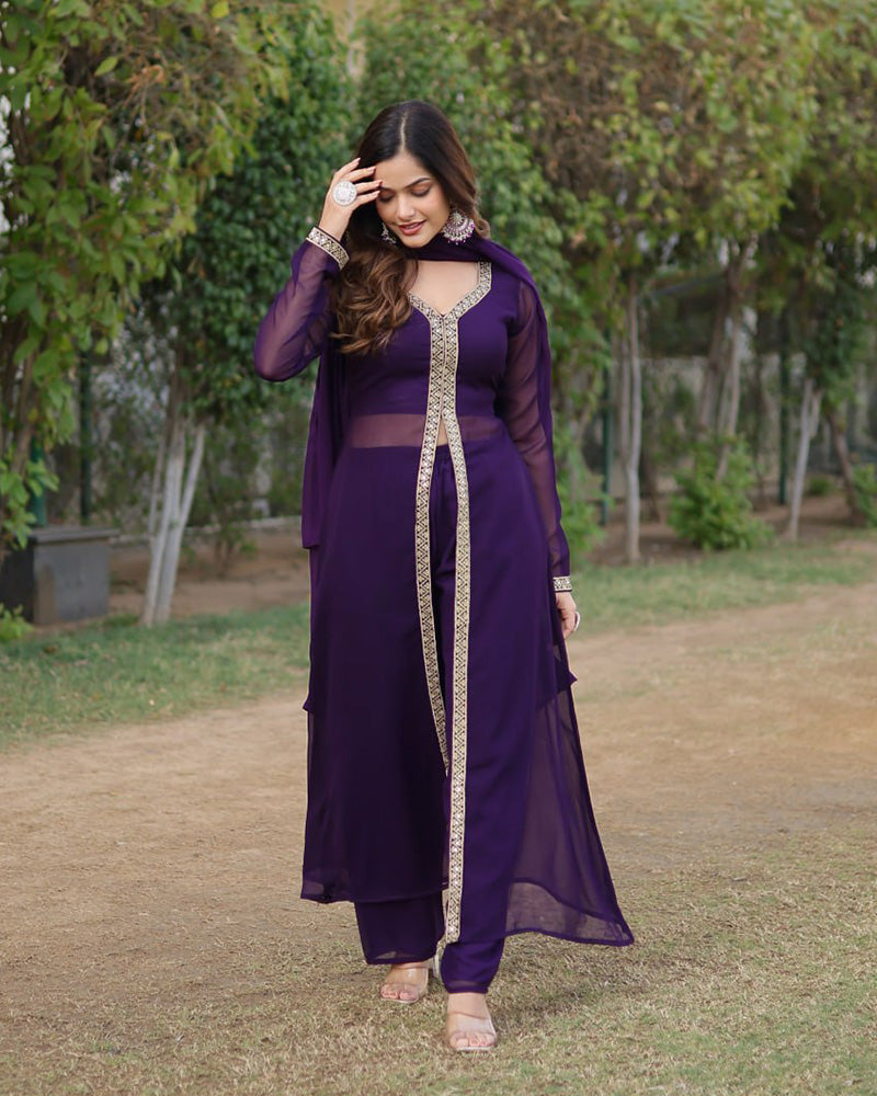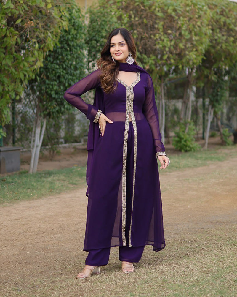 Step into contemporary elegance with this Western Designer Wine Color Georgette Three-Piece Kurti Suit. The rich wine hue adds sophistication, while the georgette fabric enhances the modern appeal. Meticulously designed, the three-piece suit includes a stylish kurti, paired with coordinating bottoms and a dupatta, creating a fashionable ensemble. Ideal for social gatherings, parties, or special occasions, this Wine Color Georgette Kurti Suit promises a chic and refined presence. Embrace the modern aesthetic with this statement piece that celebrates the richness of wine and the stylish allure of Western design for a truly captivating and memorable look.