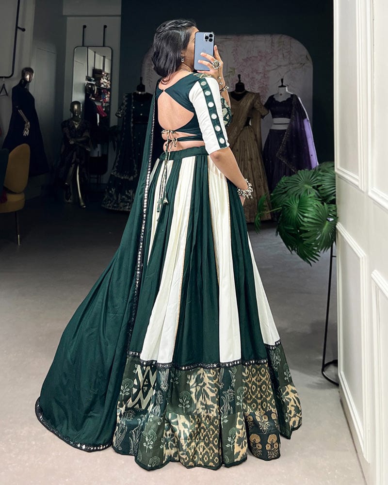 Charming white and green rayon Navratri lehenga choli with eye-catching traditional prints and mirror detailing, ideal for festive occasions and lively Garba nights.