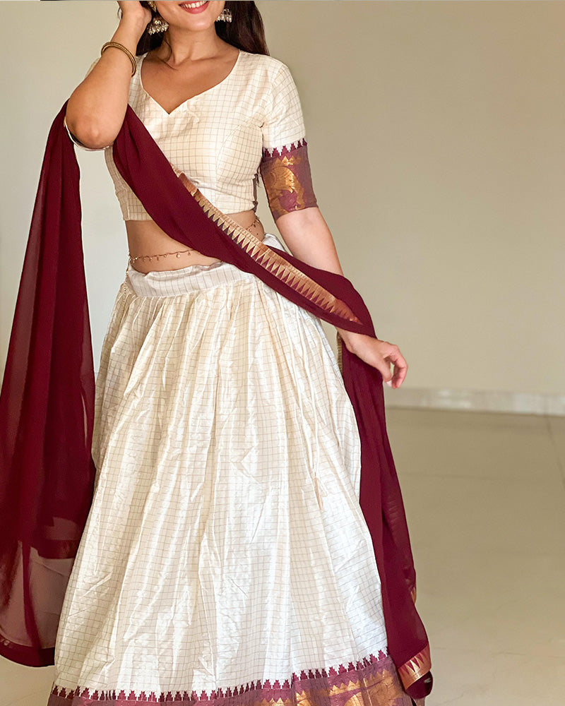 Celebrate Navratri in style with this White and Maroon Color Poly Cotton Chex Lehenga Choli. Crafted from soft poly cotton, this ensemble features a striking chex pattern that blends traditional charm with modern elegance. The combination of white and maroon adds a vibrant touch, perfect for festive occasions. Paired with an unstitch blouse for a custom fit, this lehenga choli ensures you stand out beautifully during Navratri celebrations.