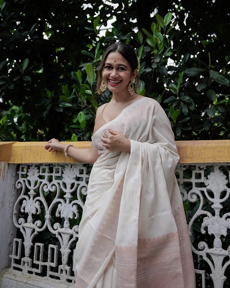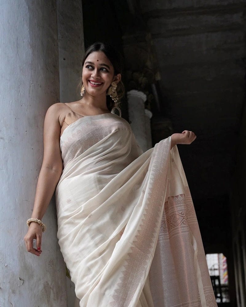 A pristine white Banarasi jacquard soft silk saree, featuring intricate weaving and elegant traditional patterns. Perfect for weddings, festive occasions, and cultural events, this saree radiates timeless charm and sophistication. Paired with an unstitched blouse piece, it allows for personalized tailoring to complete your look.