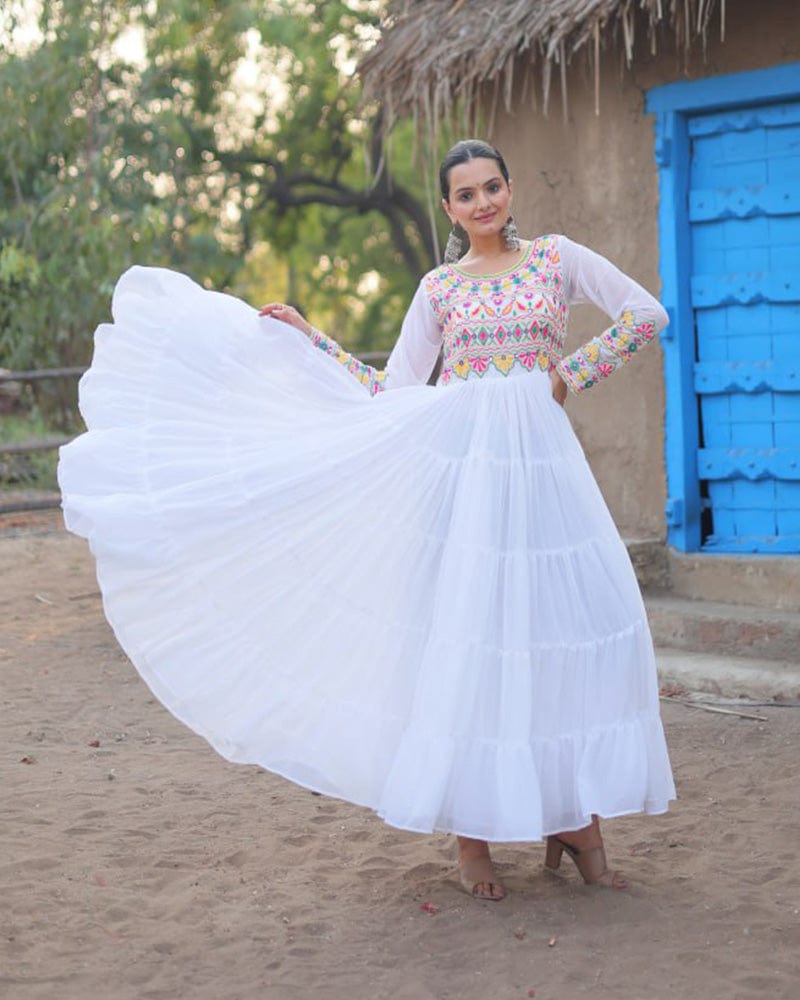 The White Color Blooming Ruffle Style Navratri Gown exudes grace and charm with its blooming ruffle detailing. This gown is designed to elevate your Navratri celebrations with its elegant and contemporary style, making it a perfect choice for festive occasions.