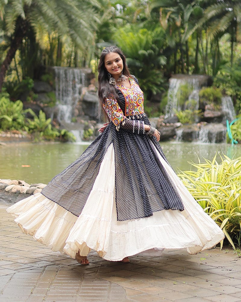 This white Kora cotton lehenga paired with a black kurti offers a striking contrast, blending elegance with sophistication. The breathable Kora cotton fabric of the lehenga ensures comfort, while the black kurti adds a bold and chic touch, perfect for festive gatherings and traditional events.