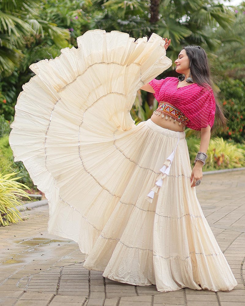This white kora cotton lehenga is paired with a vibrant pink choli, creating a stunning contrast that blends traditional charm with modern style. Perfect for festive occasions, this ensemble offers a combination of elegance and comfort.