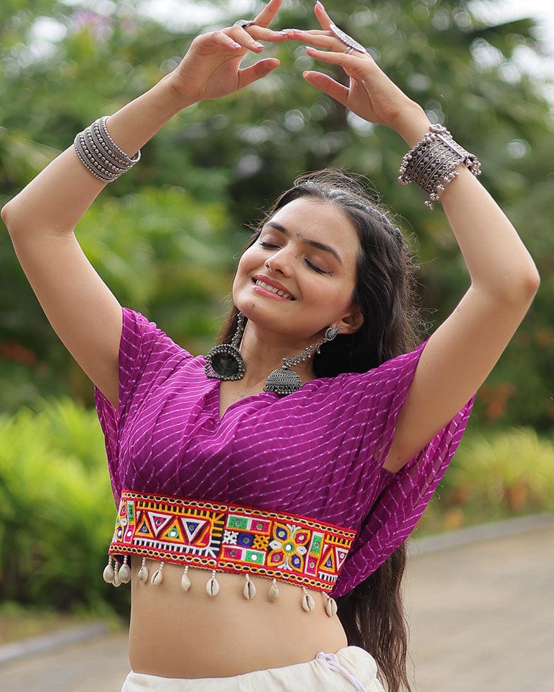 This white kora cotton lehenga, paired with a rich purple choli, creates a striking and elegant contrast. Perfect for festive occasions, this ensemble combines traditional charm with a modern aesthetic, offering a stylish and comfortable choice for any celebration.