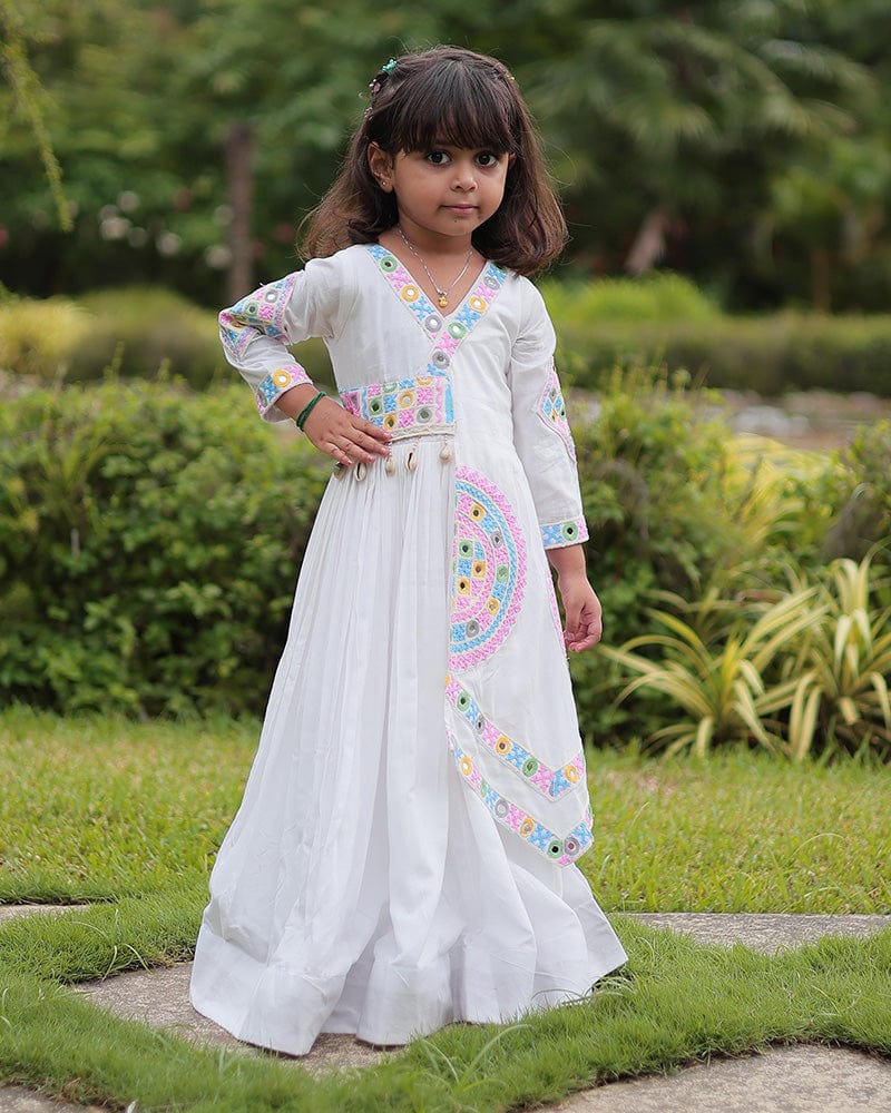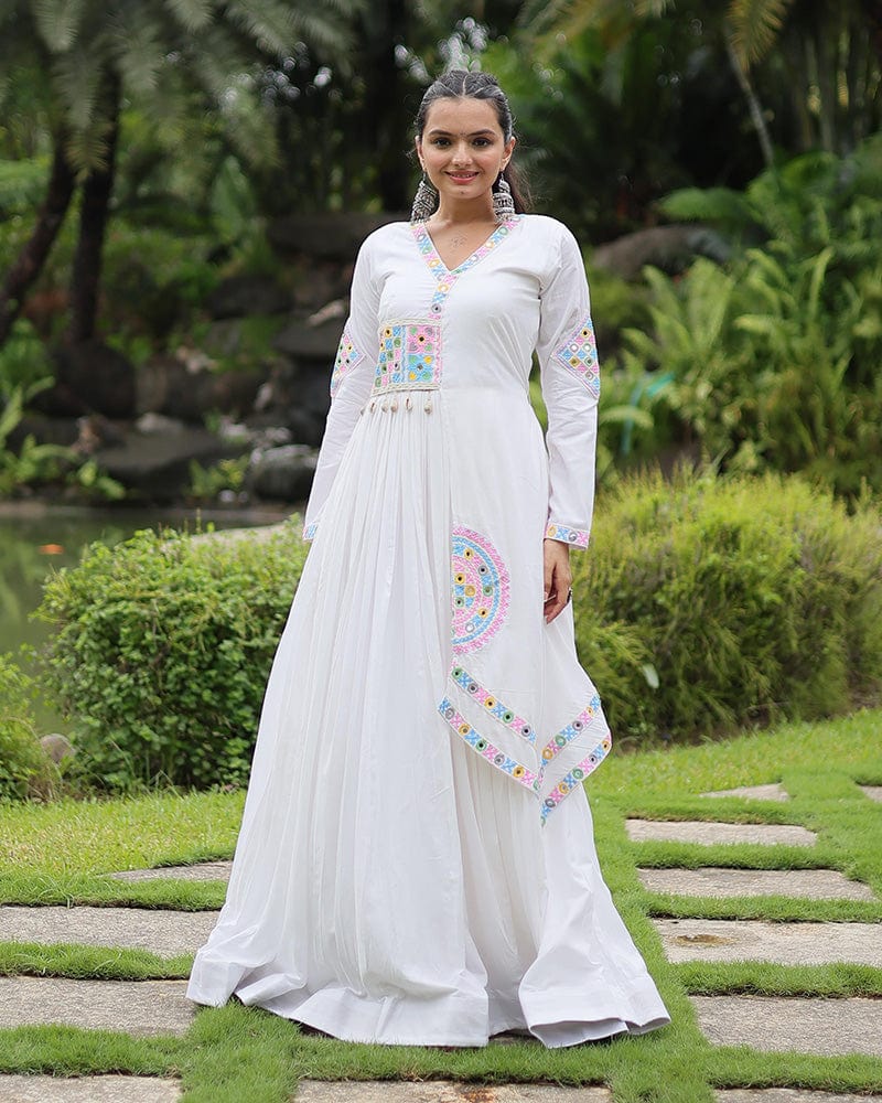 Celebrate Navratri in a blend of elegance and tradition with this white rayon gown. Featuring exquisite Kutchi style embellishments, this gown offers a graceful silhouette and intricate details, perfect for festive occasions.