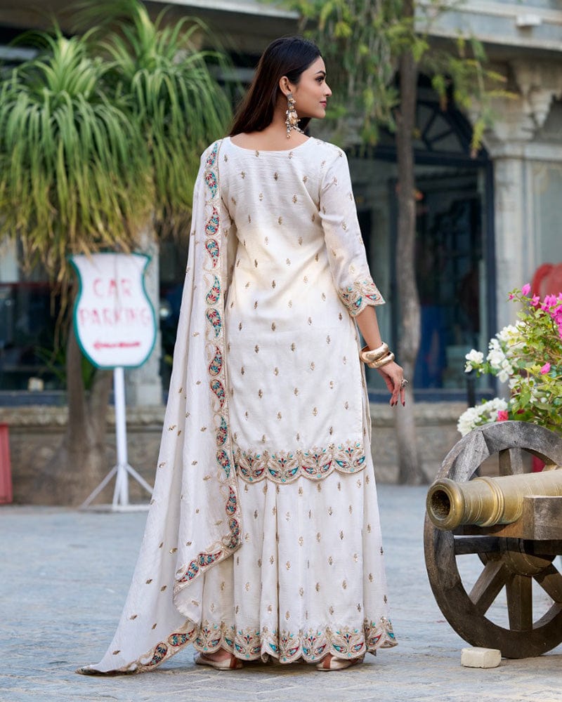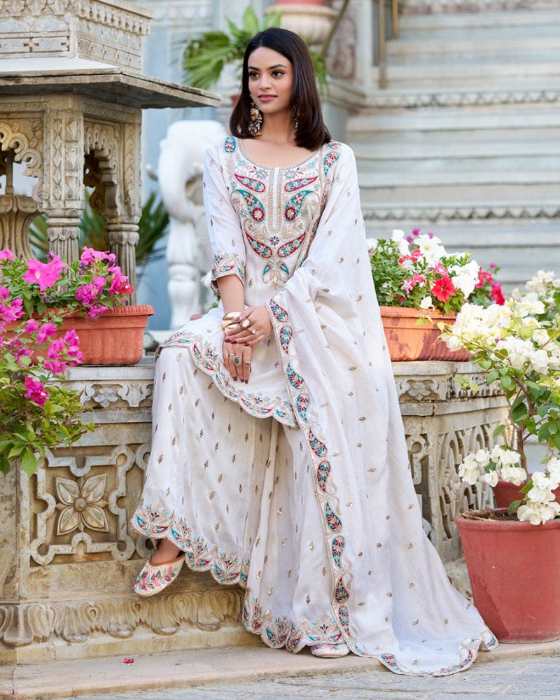 Radiate elegance with this White Vichitra Silk Three-Piece Kurti Suit. Crafted from luxurious fabric, it features a stylish kurti, matching bottoms, and a dupatta, making it perfect for weddings, festive occasions, and cultural celebrations.