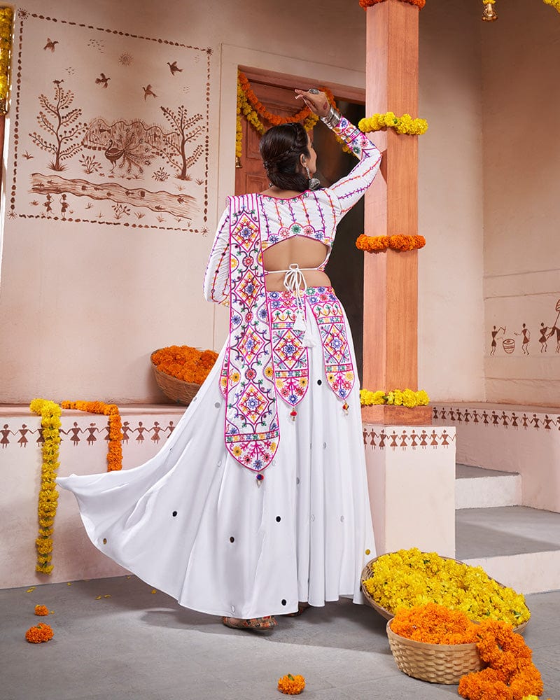 White Color Viscose Rayon Thread And Mirror Work Fully Stitched Navratri Lehenga Choli