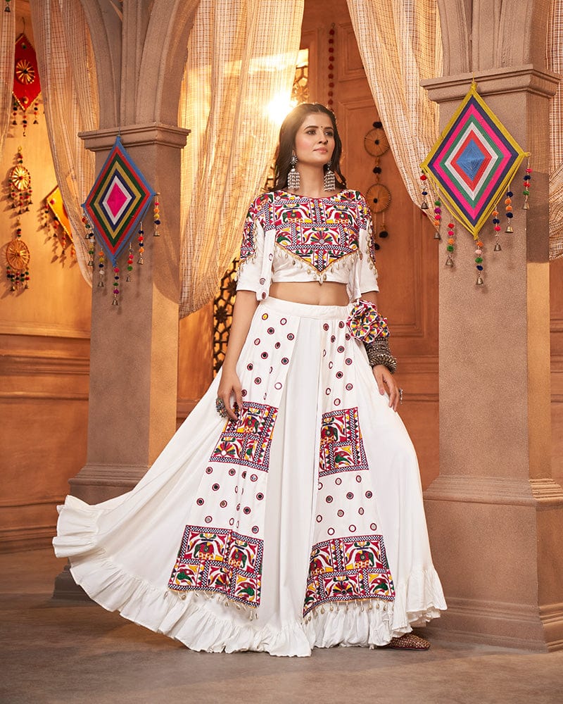 White Color Viscose Rayon Threaded Fully Stitched Navratri Lehenga Choli