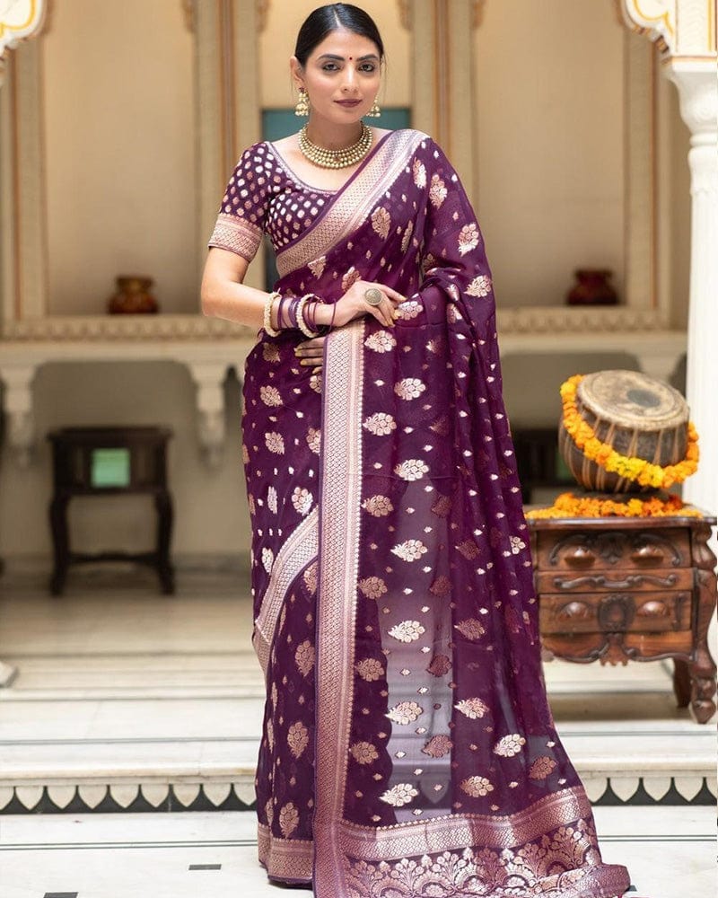 Wine Color Banarasi All Over Jacquard Soft Silk Saree