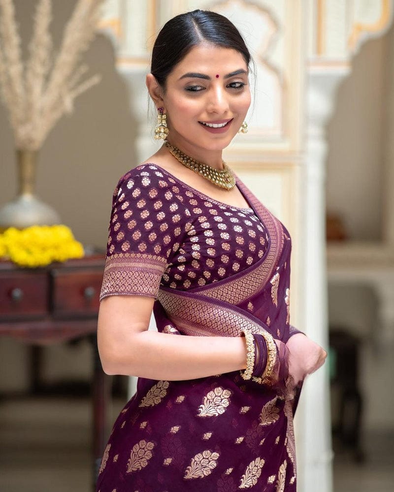 Wine Color Banarasi All Over Jacquard Soft Silk Saree