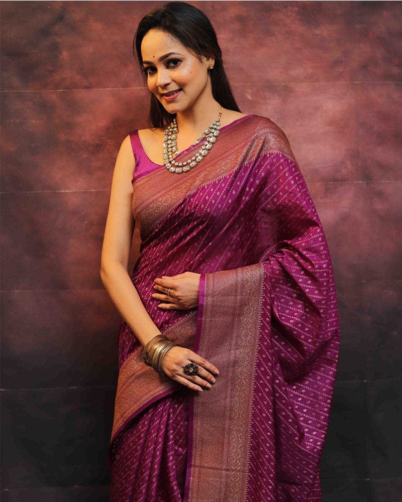 A luxurious Banarasi soft silk saree in an opulent wine shade, featuring intricate traditional weaving that enhances its elegance. Paired with an unstitched blouse piece, it allows for personalized tailoring to complement the ensemble. Ideal for weddings, festive occasions, and special celebrations, this saree radiates timeless sophistication and charm.