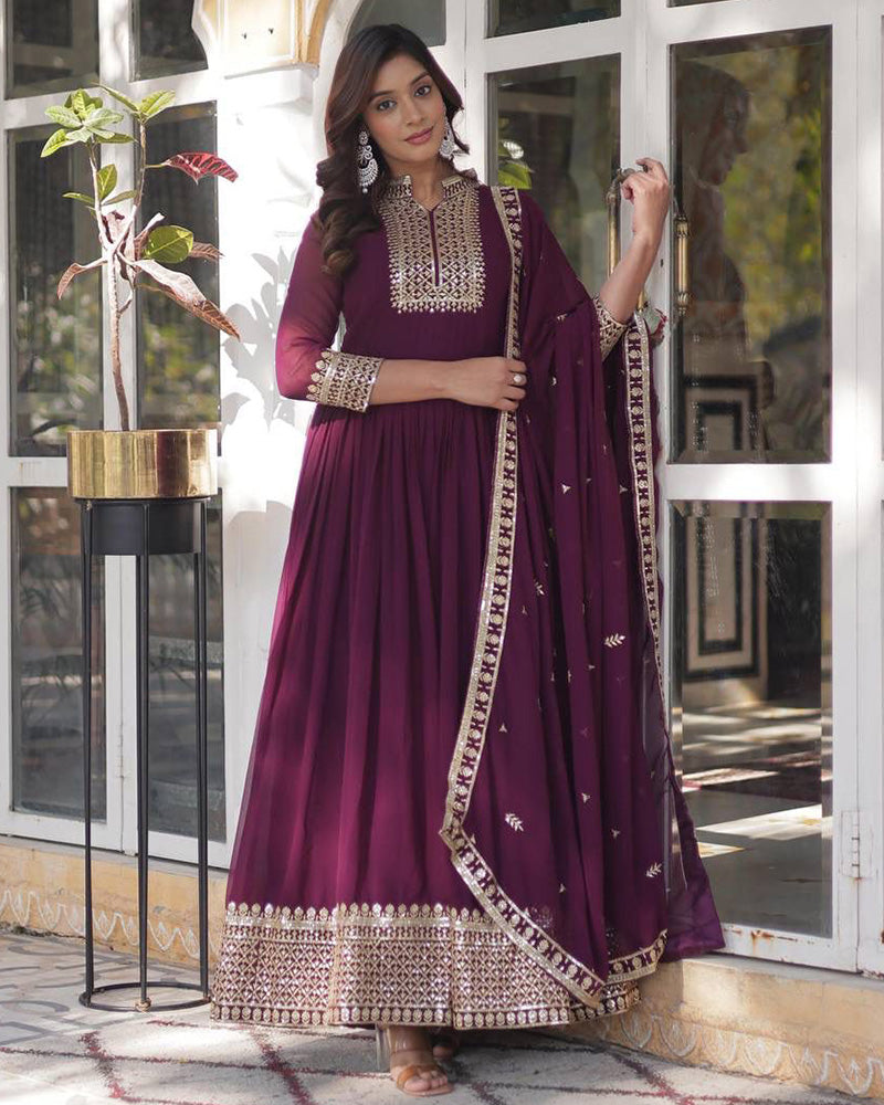 Turn heads with this Wine Faux Blooming Rich Embroidered Work Gown. Adorned with intricate embroidery on premium fabric, this gown is ideal for weddings, festive occasions, and special celebrations. Its regal color and elegant design exude luxury and sophistication.